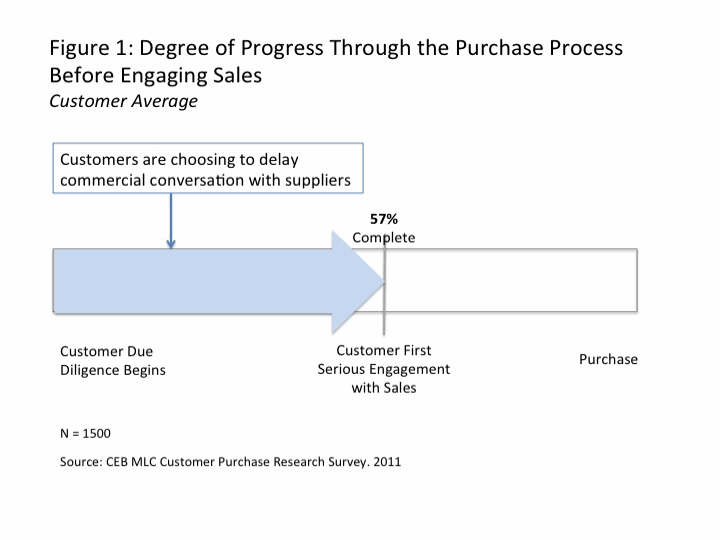 But, research from Google and CEB entitled The Digital Evolution in B2B Marketing provides new insight into buyer behavior, and it challenges the conventional wisdom. According to the study, customers reported to being nearly 60% through the sales process before engaging a sales rep, regardless of price point. More accurately, 57% of the sales process just disappeared.